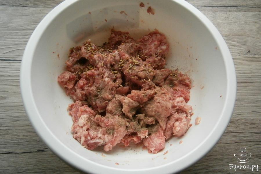 2. Измельчить мясо до состояния фарша или перекрутить его на мясорубке. Добавить соль, приправу и черный перец.