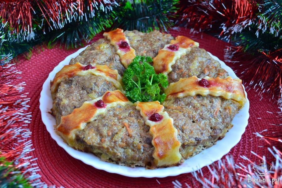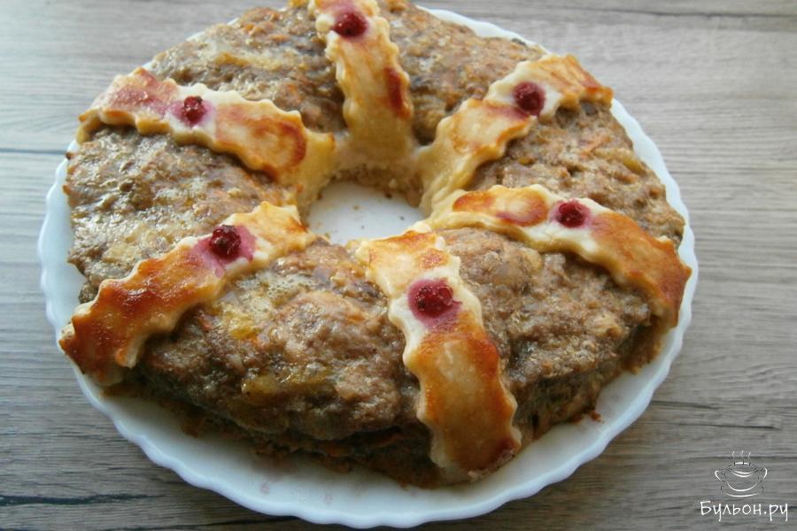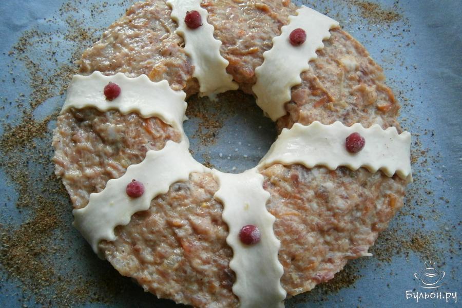 Мясной венок - это вкуснейшее мясное праздничное блюдо, которое особенно будет уместно на новогоднем, рождественском и пасхальном столе. Приготовить это блюдо совершенно не сложно, а вкус - потрясающий. Нежное и сочное мясо, необычайно вкусное и ароматное - вам и вашим гостям обязательно придется по вкусу. Я использовала свинину, можете заменить ее курицей, говядиной, телятиной или смешать мясо. Для ленты, которая украшает мясной венок лучше использовать слоеное бездрожжевое тесто.