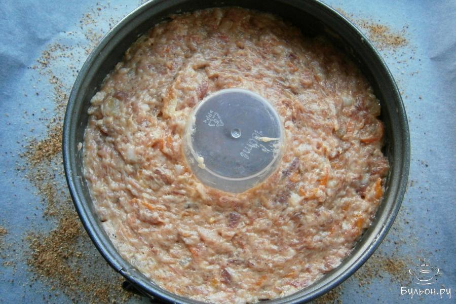 6. Фарш еще раз тщательно перемешать и выложить его в форме кольца, используя небольшую разъемную форму, которую нужно поместить на противень, застеленный пергаментом и посыпанный сухарями. Посередине, чтобы получилось отверстие поместить любой стакан.