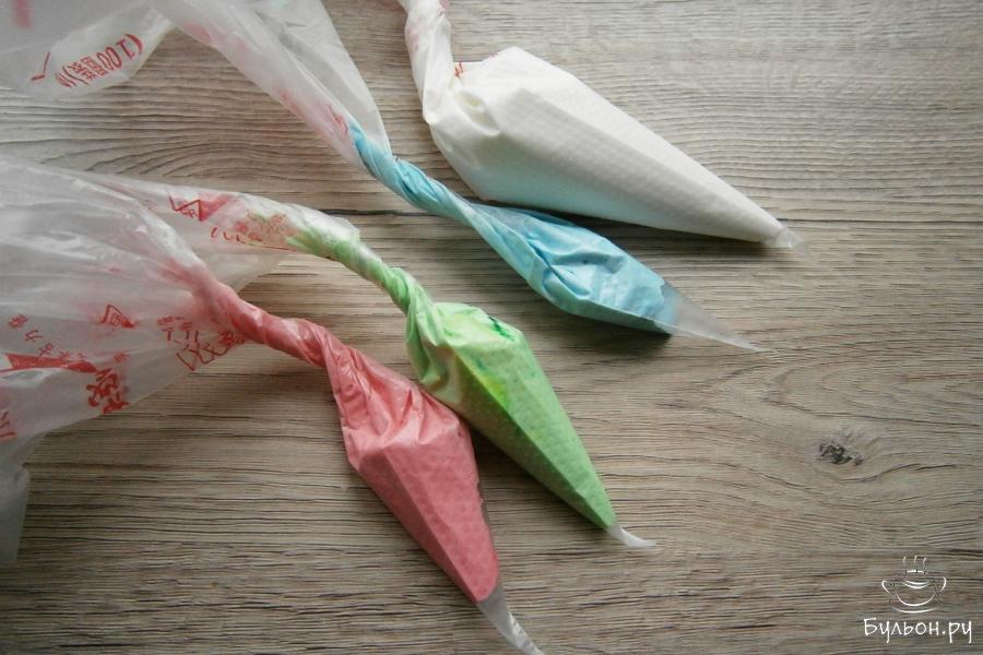 11. Разделить глазурь на части, в каждую - добавить пищевой краситель любого цвета, хорошо растереть. Разложить глазурь по пищевым мешочкам, срезав кончики.