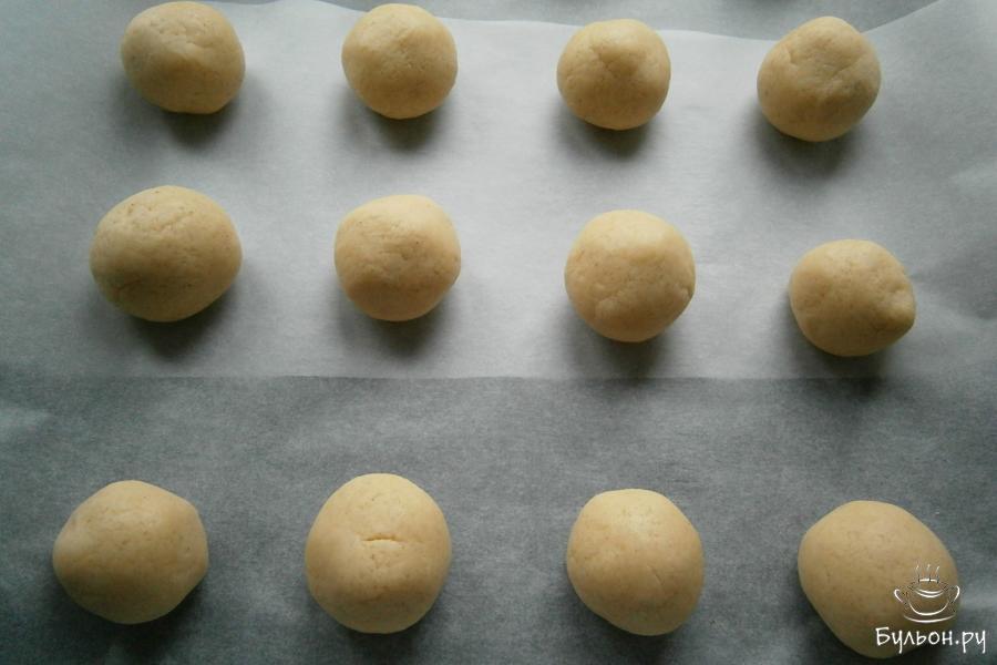 5. Разделить тесто на 16 частей, каждую - скатать в шарик. Пергаментом застелить противень и выложить шарики на расстоянии друг от друга 8-10 см.