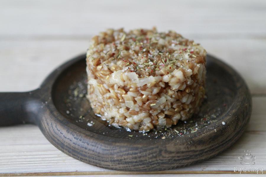 6. По готовности крупы добавить в кастрюлю лук и хорошо перемешать кашу. Закрыть крышкой и дать настояться 10 минут.