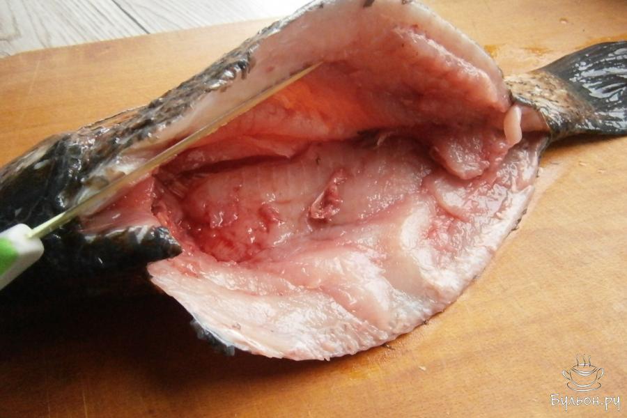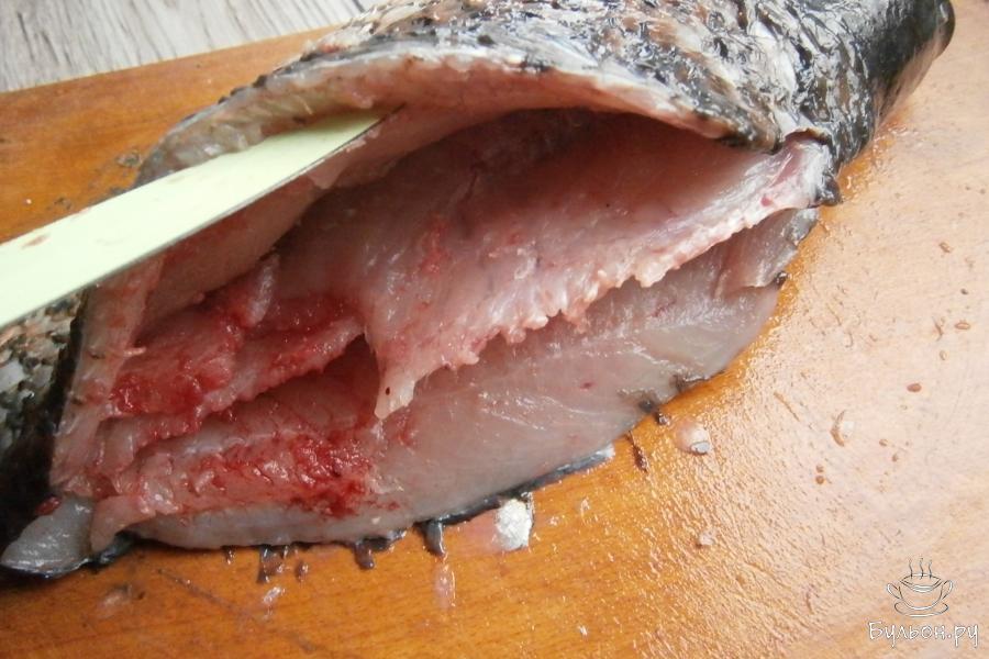1. Самое хлопотное в этом рецепте - это разделать и выпотрошить карпа особым способом. Для этого: целого карпа очистить, удалить из головы жабры. Рыбу вымыть. По хребту, с двух сторон сделать острым ножом глубокие надрезы. Со стороны головы и хвоста хребет разрубить.