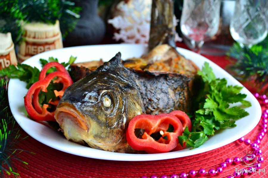 13. Запекать фаршированного карпа 1 час при температуре 180 гр., после чего аккуратно его переложить на большое блюдо.
