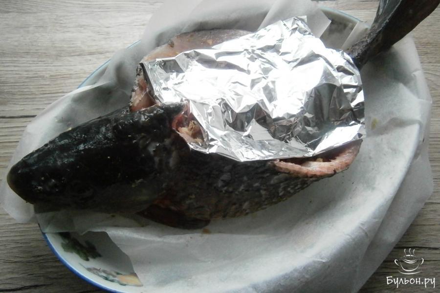 12. Рыбу смазать растопленным сливочным маслом, а начинку прикрыть листом фольги, чтобы не засохла при выпечке.
