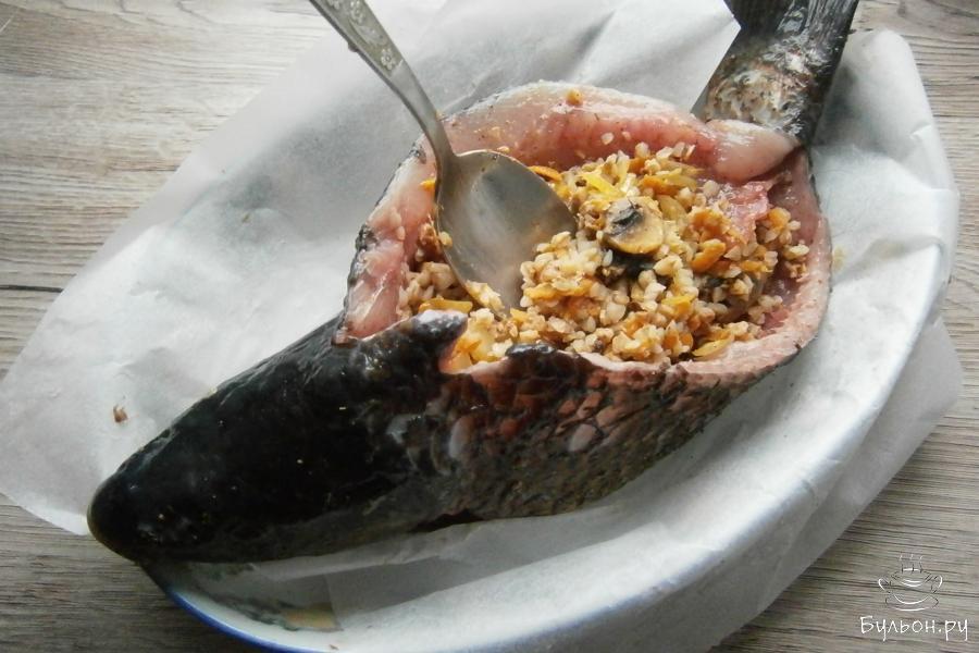 11. Карпа нафаршировать гречкой с грибами и поместить его спинкой кверху в форму для запекания, застеленную пергаментом.