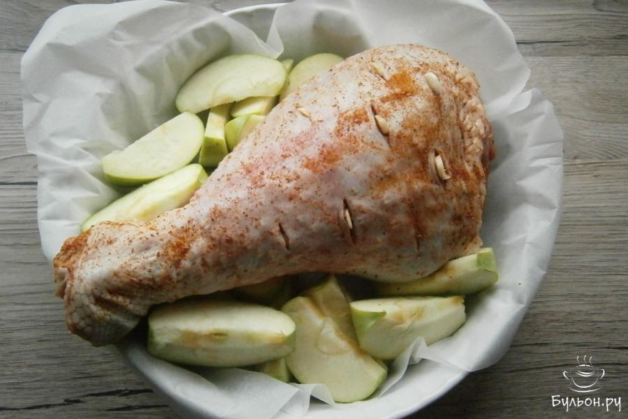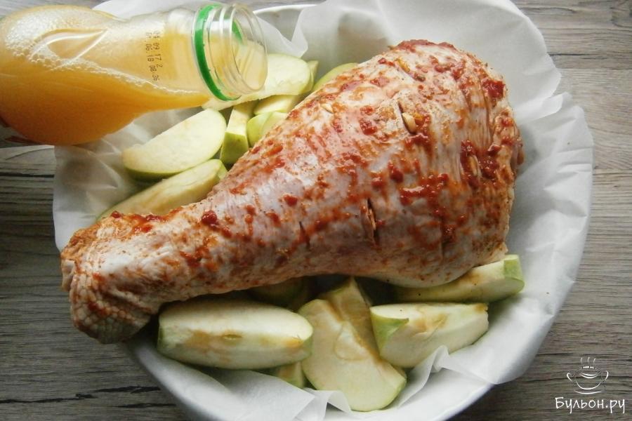 4. Отправить голень с яблоками в духовку. Запекать при температуре 160 градусов около полутора часов. После этого, яблоки аккуратно достать из формы, голень индейки полить соусом, в котором она запекается. Фольгу убрать и запекать далее еще час, увеличив температуру до 180 гр.