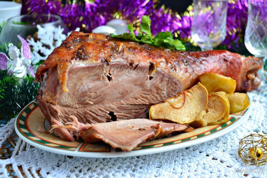 6. Далее, голень индейки переложить на блюдо, рядом разместить запеченные яблоки в качестве гарнира, подать блюдо к столу. Приятного аппетита.