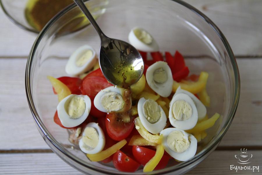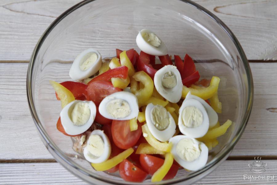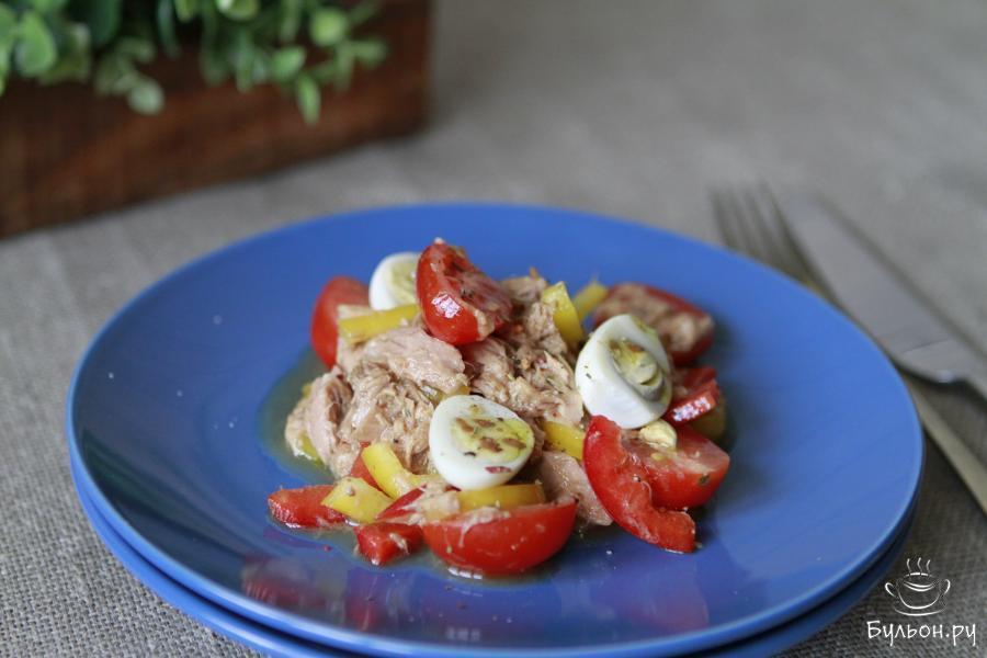 Овощной салат с тунцом и яйцами вполне подойдет для легкого ужина. Салат получается легким, сытным и невероятно вкусным. Ингредиенты в салате могут быть разными, но основные это тунец. В нашем случае салат состоит из консервированного тунца, помидорок черри, болгарского перца и перепелиных яиц. В качестве заправки лучше всего использовать оливковое масло с бальзамическим уксусом и приправами. Для пикантности и аромата можно еще добавить горчицу и лимонный сок. Подавать салат рекомендуется сразу же после его приготовления.