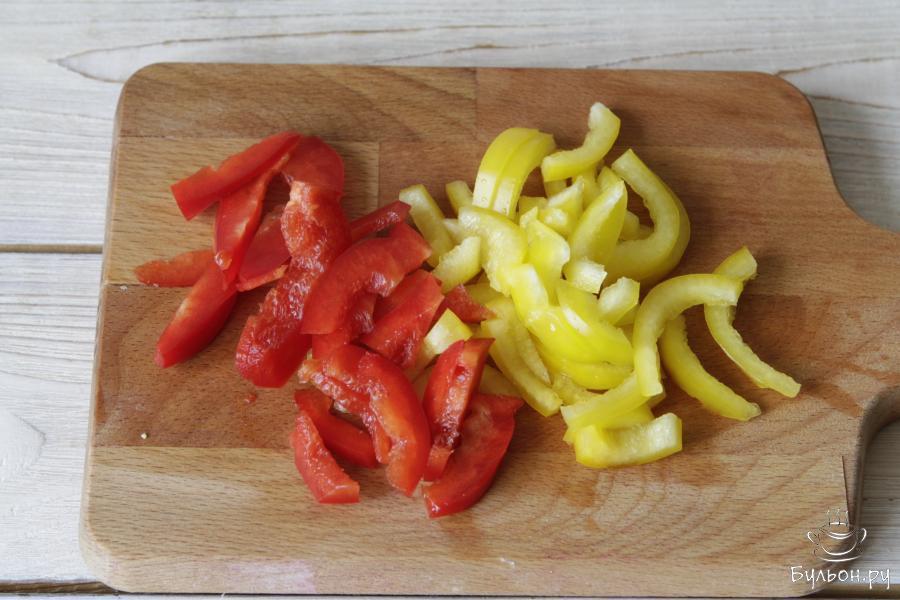 3. Болгарский перец нарезать небольшими брусочками (для разнообразия перец можно выбрать разных цветов).