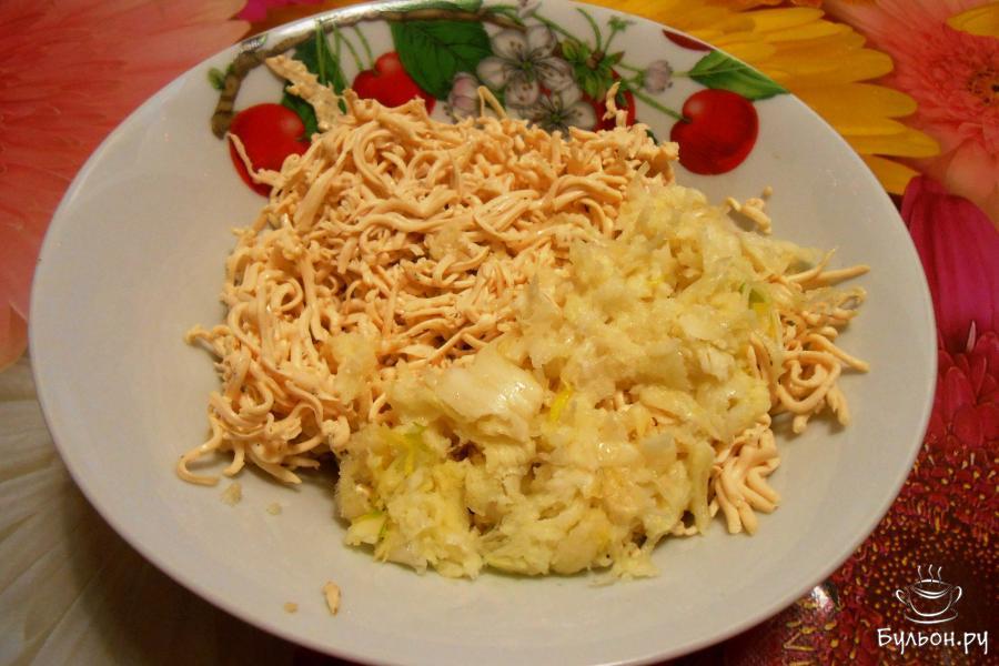 3. Чеснок почистить и пропустить через пресс. Соединить плавленный сыр и чеснок. Хорошо перемешать вилкой.