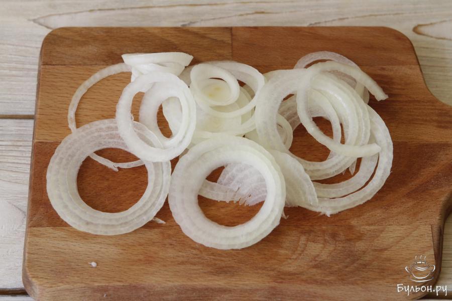 3. Лук почистить и нарезать кольцами. По желанию его можно замариновать в бульзамическом уксусе, это позволит избавиться от горечи. Либо просто промыть под проточной водой.