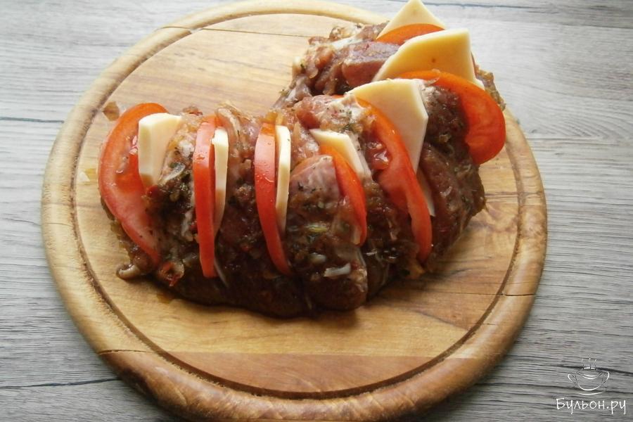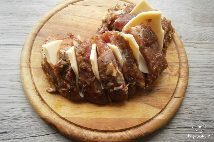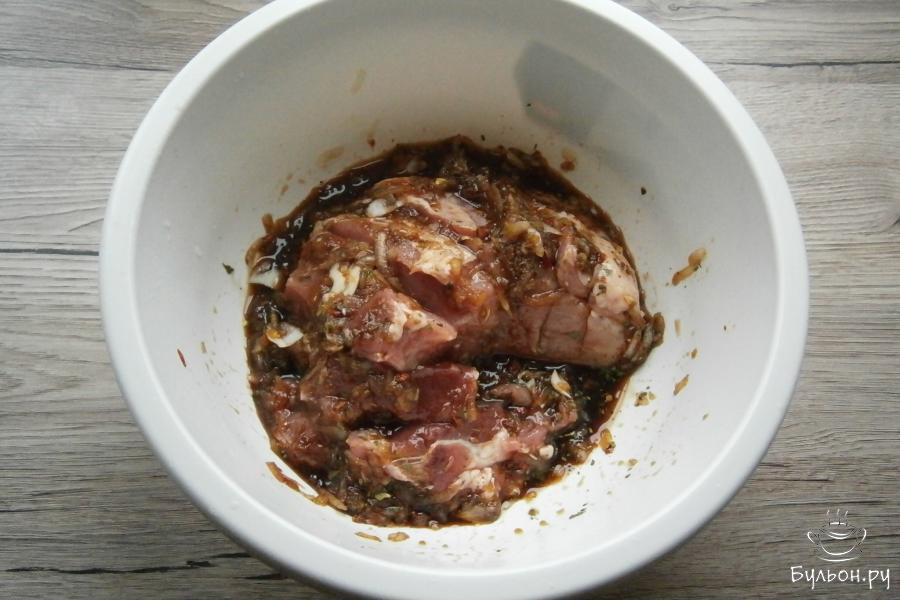 3. Добавить в маринад немного паприки кусочками и поместить в него свинину. Поместить миску в холодильник на 12 часов, пару раз мясо следует перевернуть.