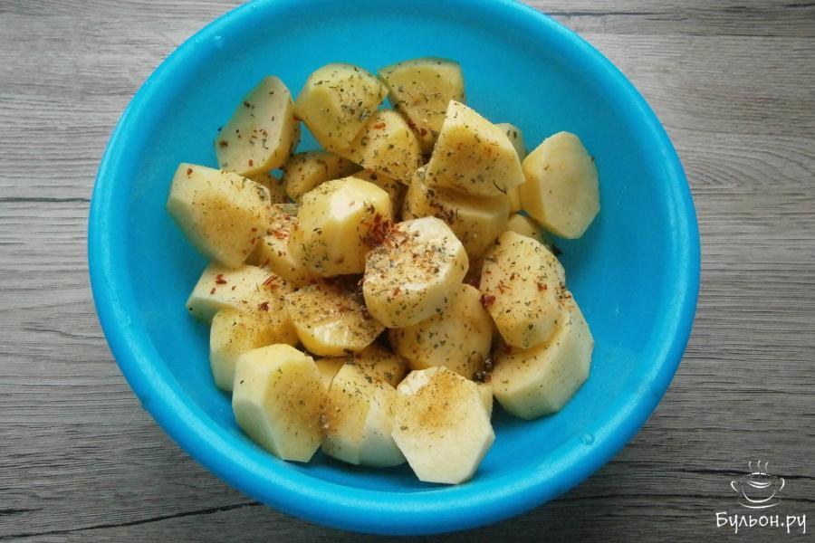 6. Картофель очистить и порезать произвольными, но довольно крупными кусками. Картофель посыпать приправой универсальной, немного - паприкой, посолить и влить растительное масло. Хорошенько перемешать.