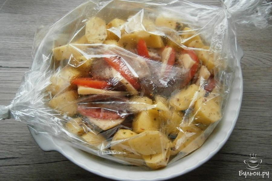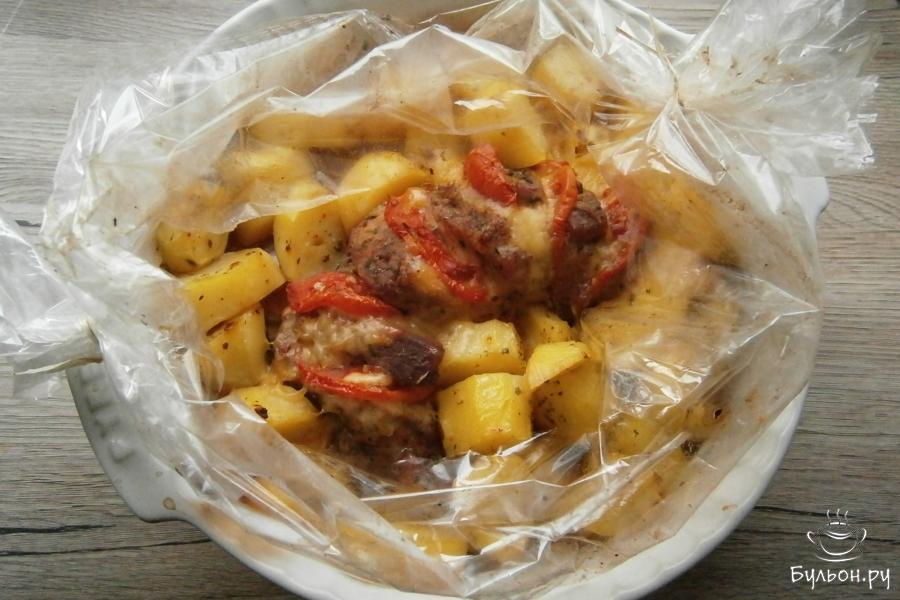 7. Мясо вместе с порезанным картофелем поместить в рукав, предназначенный для запекания, концы которого тщательно закрепить.