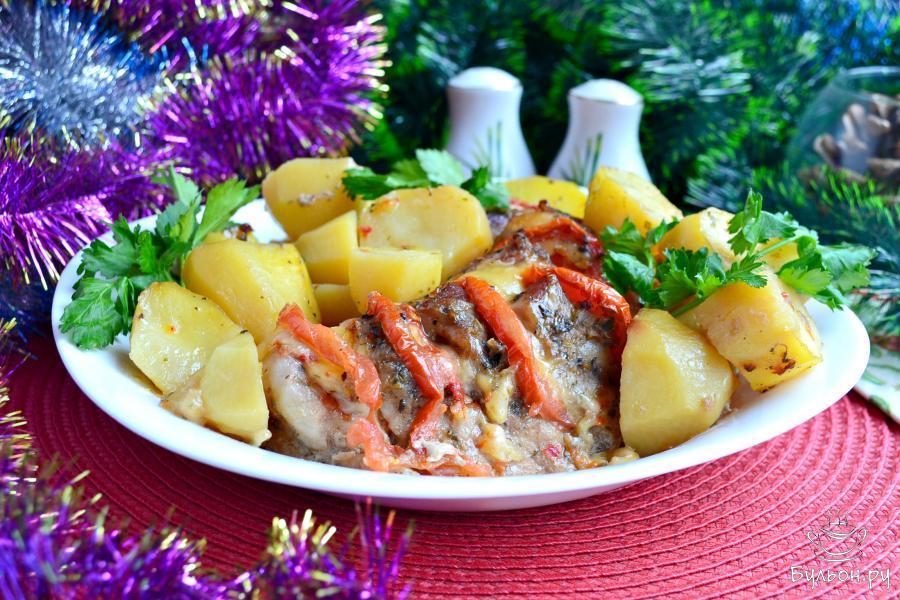 Нежная, сочная и безумно вкусная свинина "Праздничная", которая запекается в рукаве вместе с картофелем, получающемся в итоге рассыпчатым, ароматным и нежным - замечательное блюдо для любого праздничного стола. Очень удобно, что здесь сразу готовится и мясное блюдо, и гарнир. Особенно уместно это блюдо будет на Новый год и Рождество, приготовьте его обязательно. Из свинины лучше всего использовать для запекания часть ошейка, мякоти или кусок вырезки. По-желанию, к картофелю вы можете добавить и другие овощи, например, цветную капусту, морковь и т. д.