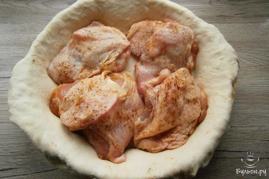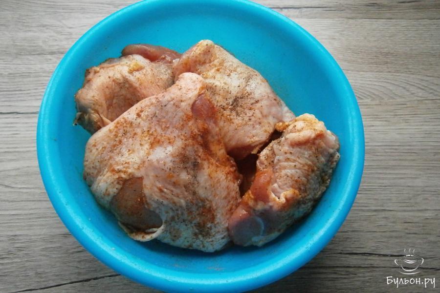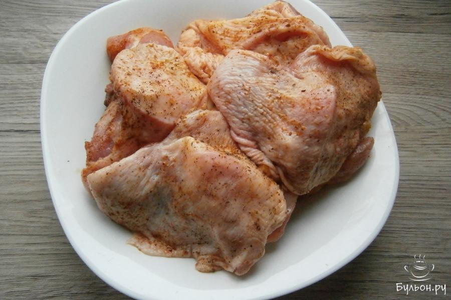 4. Куриные бедра посолить оставшейся солью, щедро посыпать приправой для курицы или любыми специями, которые вам нравятся и черным перцем.