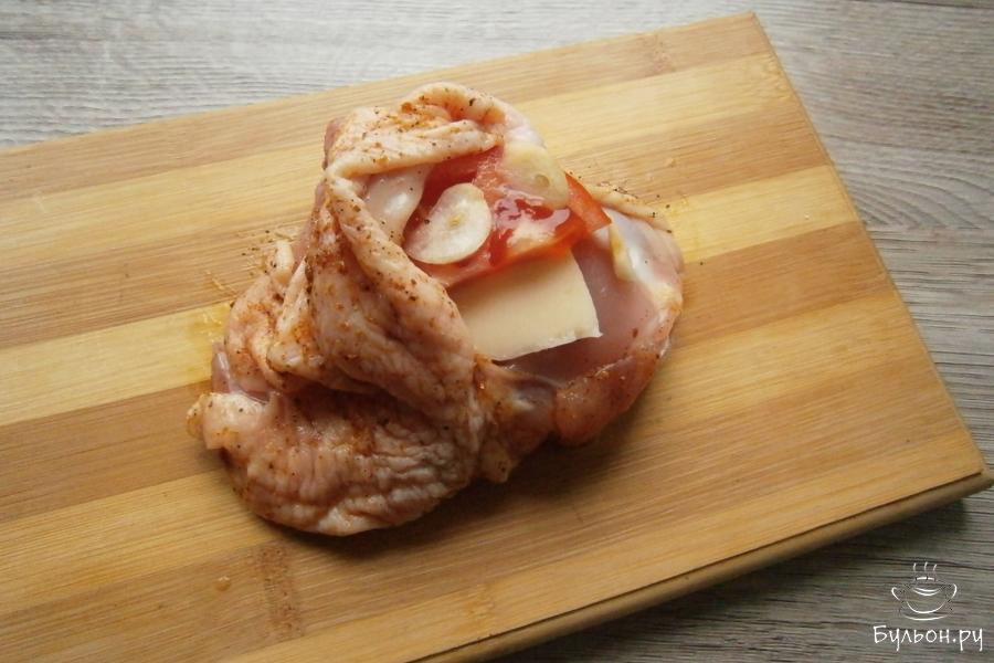 5. Затем, под кожу каждого бедрышка вложить ломоть сыра, кружочек свежего помидора и пластинку чеснока.