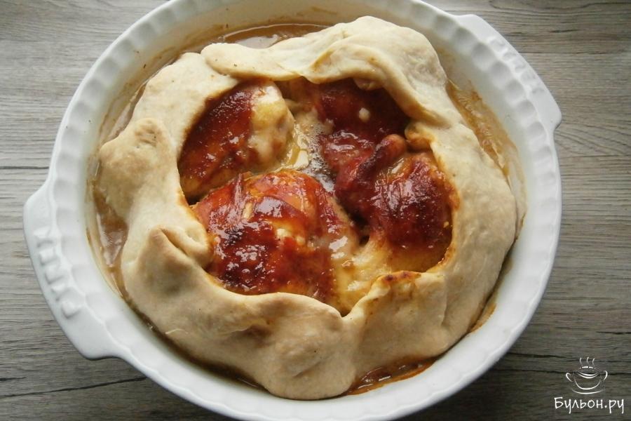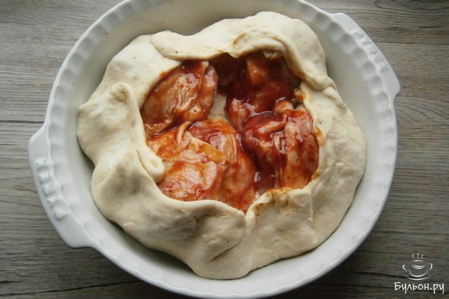 10. Бедра хорошенько смазать сверху подготовленным соусом и прикрыть краями теста по типу формирования галеты, чтобы центр остался открытым.