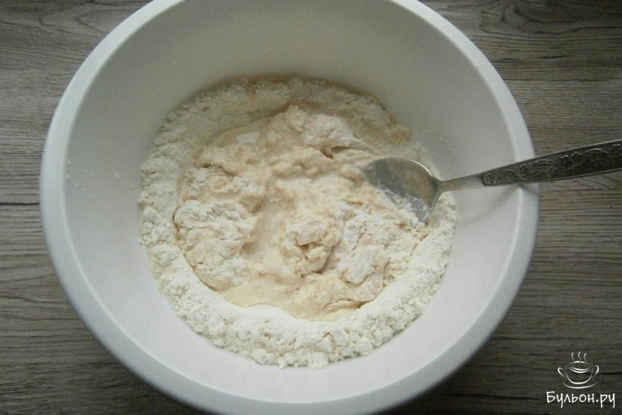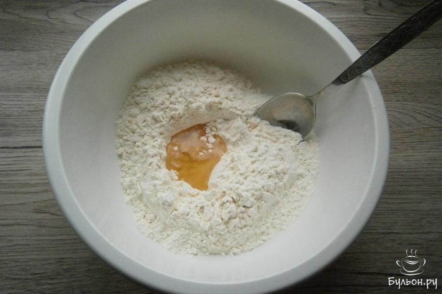 1. Прежде всего нужно приготовить тесто. Для этого: в муку добавить 1/2 ч. л. соли, влить растительное масло.
