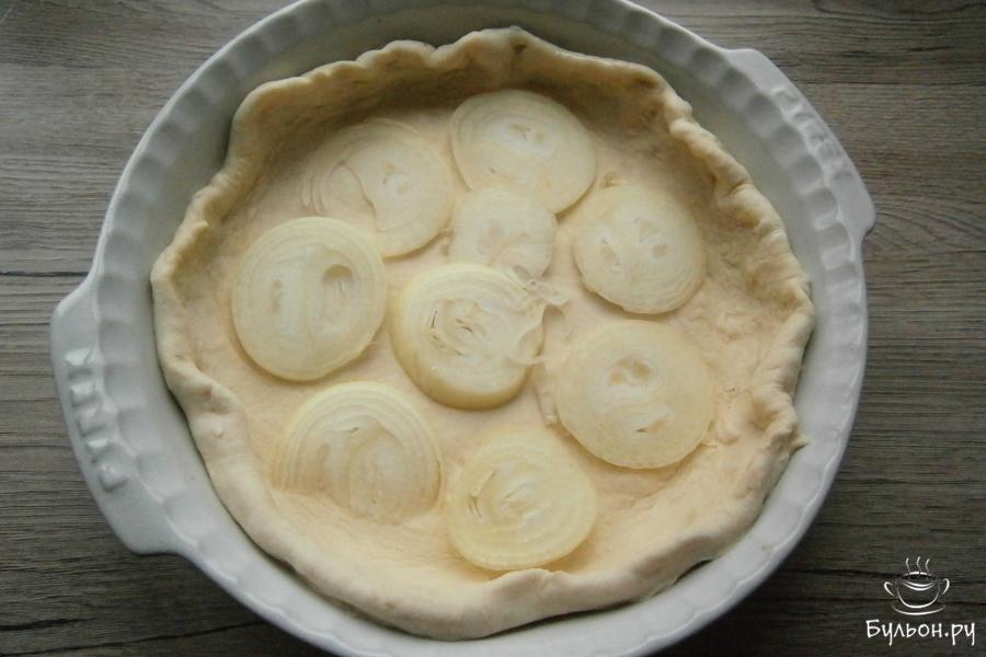 7. Тесто раскатать и выложить его в смазанную немного сливочным маслом, большую - 24-26 см в диаметре форму, чтобы получились бортики. На дно поместить порезанный кружочками репчатый лук.