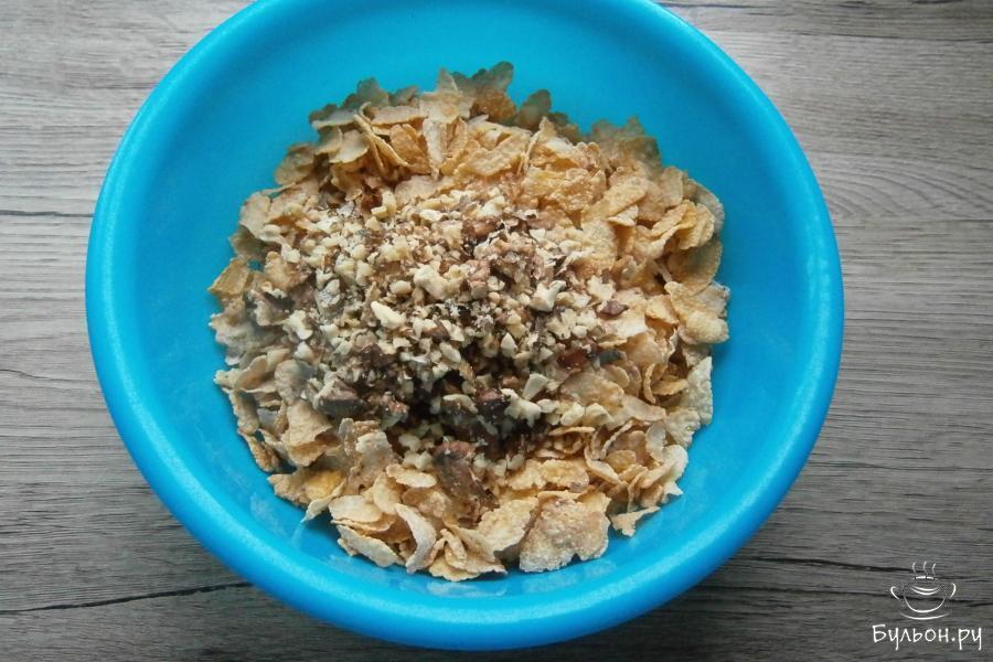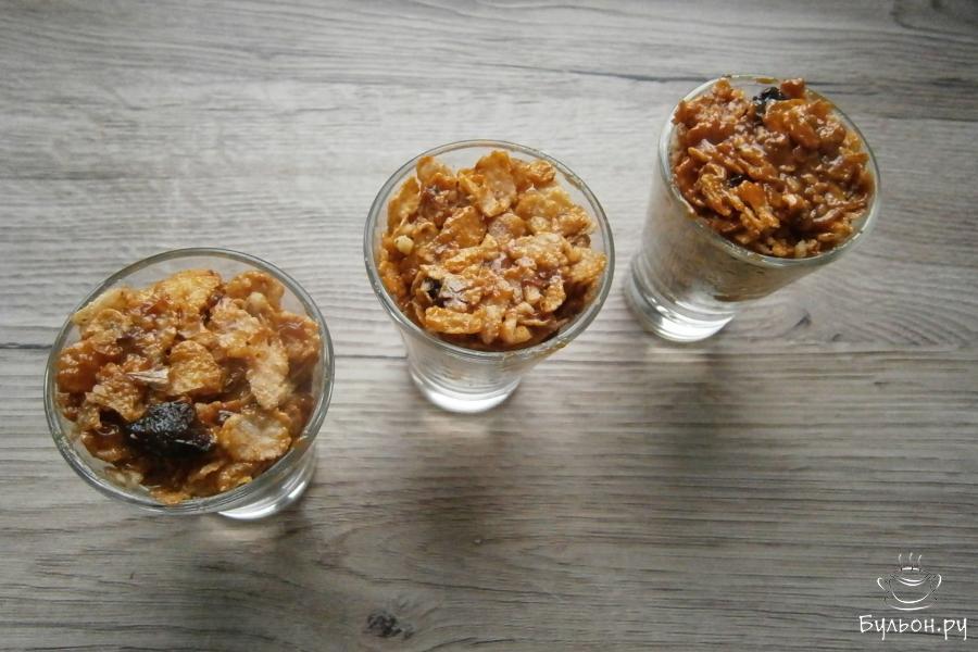 5. Далее, взять небольшие конусообразные рюмочки или стаканы, немного смочить их водой внутри и наполнить массой из кукурузных хлопьев. Немного массу следует утрамбовывать.