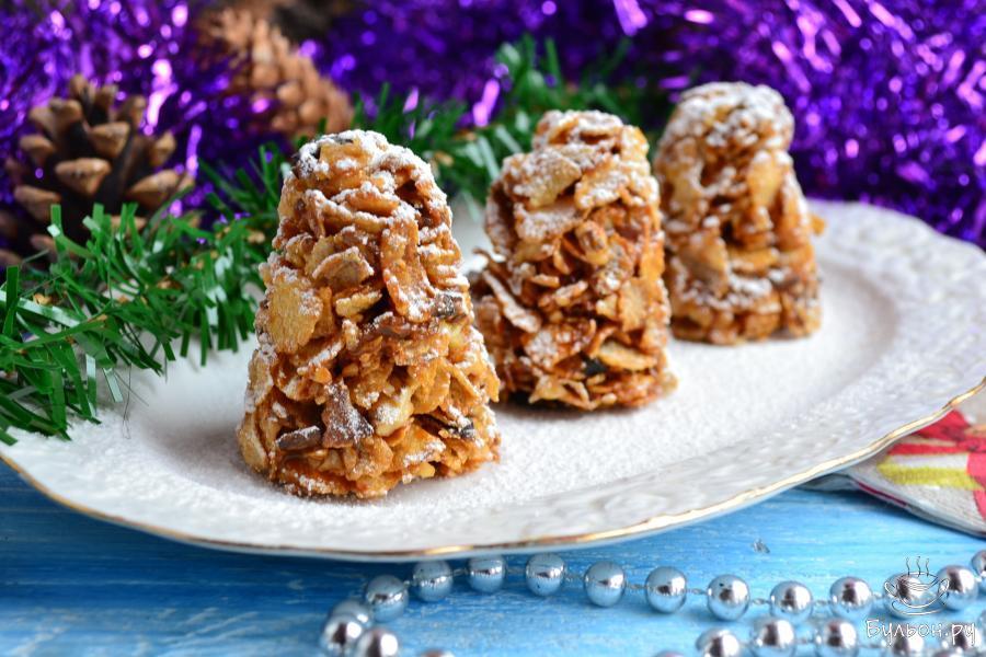 Предлагаю вам для праздничного новогоднего стола приготовить отличный десерт в виде шишек, который понравится и взрослым, и детям. Получается очень вкусно, не смотря на самые банальные ингредиенты. Выглядит десерт необычно и эффектно и однозначно все родные и гости будут в восторге. Сразу хочу предупредить, что этот десерт довольно сладкий, но на то он и десерт. Подавать "шишки" нужно сразу же после приготовления, в противном случае кукурузные хлопья утратят свою хрусткость. Обязательно попробуйте, замечательный десерт к чашечке несладкого кофе.
