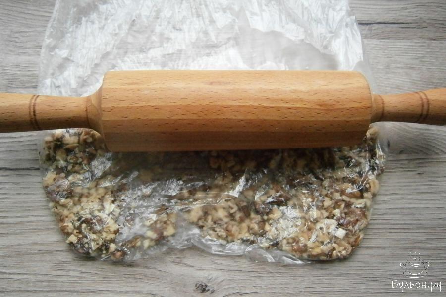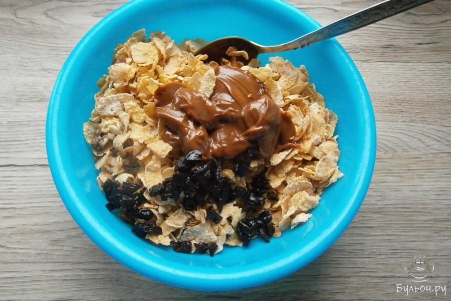 3. Сюда же, добавить вареное сгущенное молоко и порезанный небольшими кусочками вяленый чернослив. Если чернослив слишком сухой, предварительно замочите его в горячей воде.