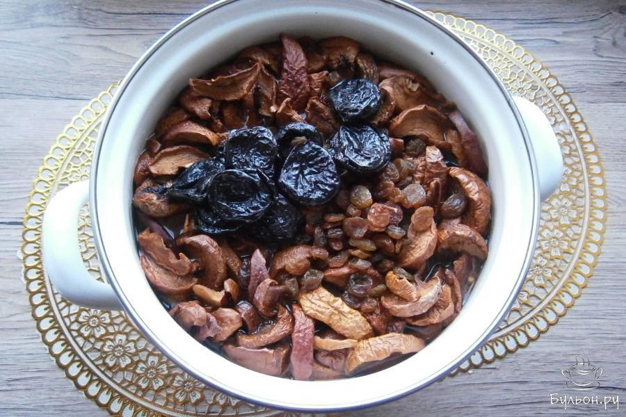 9. В теплый напиток добавить натуральный мед по вкусу, настоящий узвар готовится достаточно сладким. Все хорошенько перемешать, снова накрыть кастрюлю крышкой. Дать напитку полностью остыть и поместить его в холодильник на ночь.