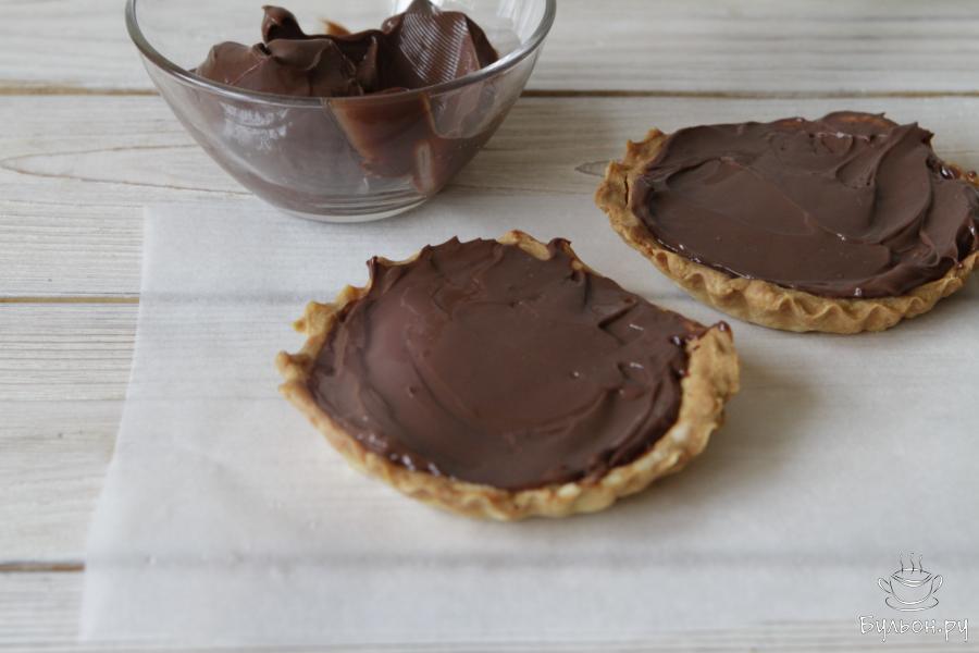 7. Остывшие тарталетки заполнить начинкой. В нашем случае это сливочно-шоколадный сыр. Можно воспользоваться готовым, а можно приготовить самостоятельно (добавить в сливочный сыр растопленный шоколад на водяной бане и перемешать).