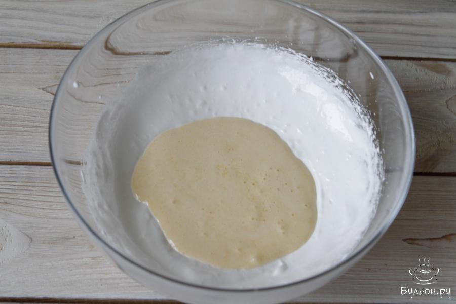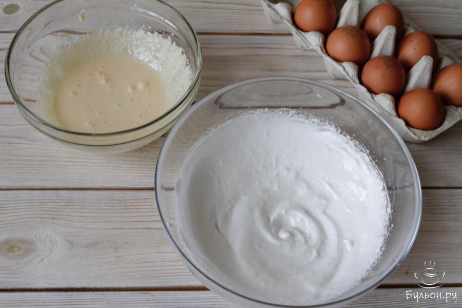 2. Аккуратно отделить белок от желтка. Белок взбить с ванильным сахаром до увеличения массы, желток с сахаром.