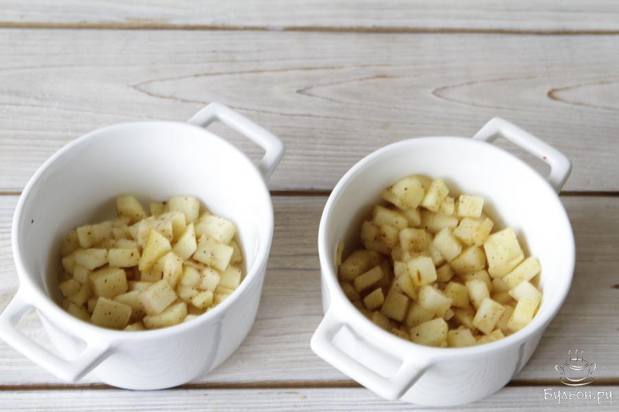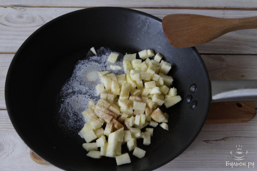 1. Одно большое яблоко почистить от кожуры, нарезать на небольшие квадратики и обжарить на среднем огне на сливочном масле с небольшим добавлением корицы (5-7 минут).