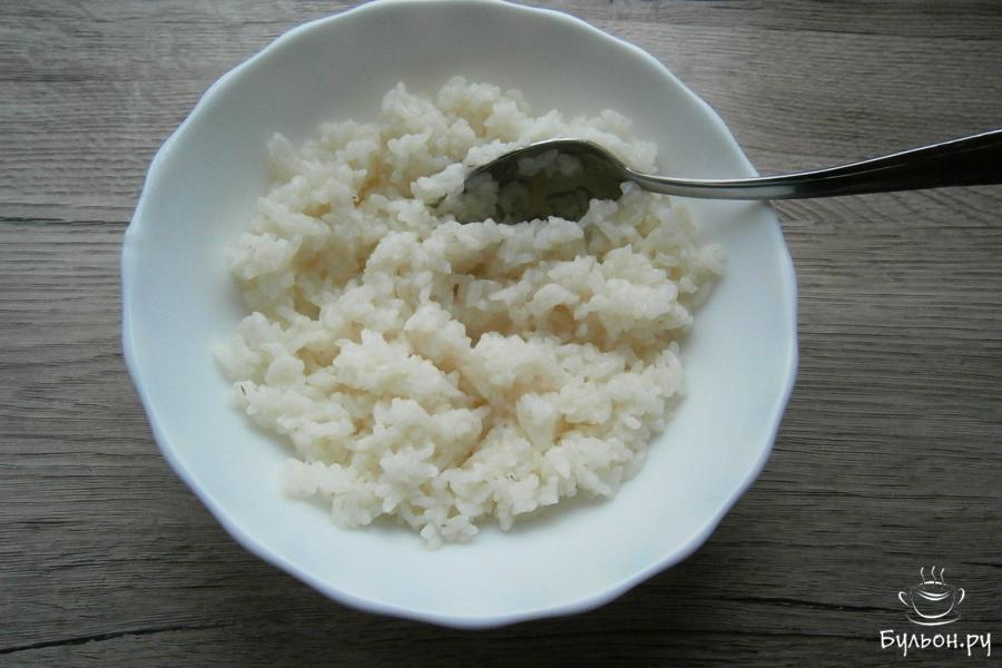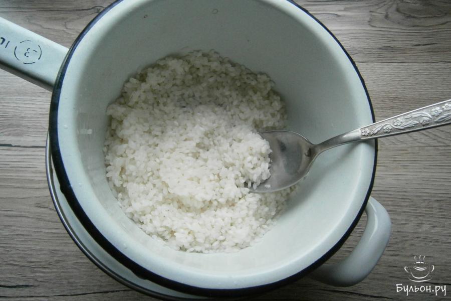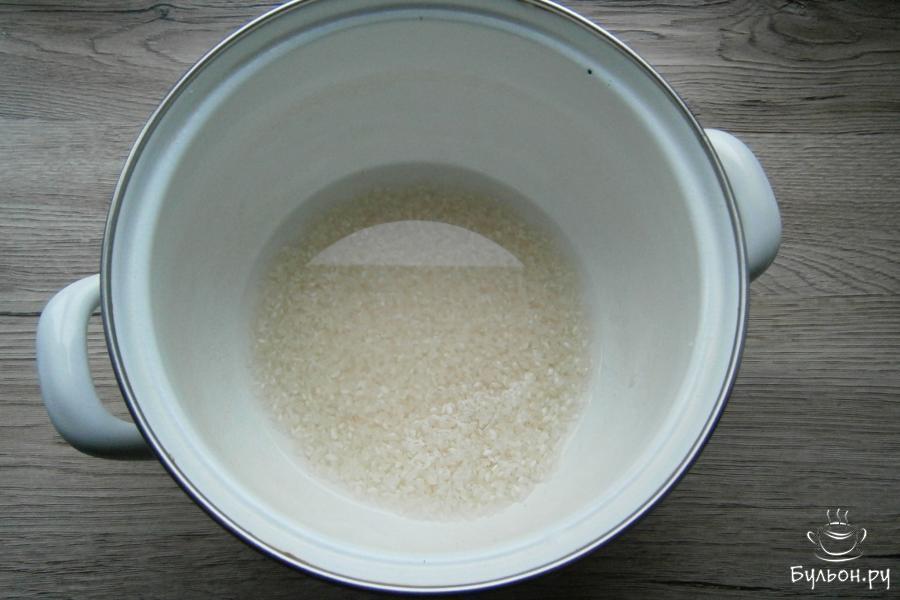 1. Промытый несколько раз рис поместить в кастрюлю, залить стаканом холодной воды, поставить на огонь и довести до кипения.