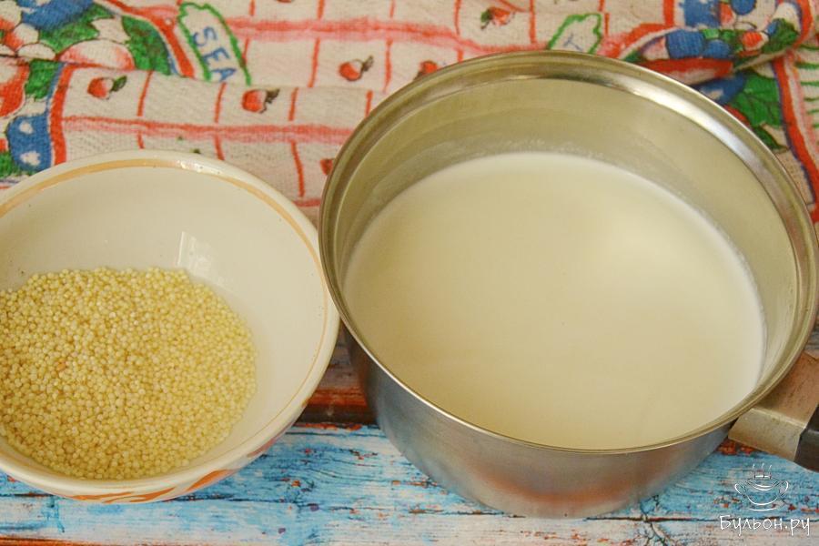 3. Пшено промоем и добавим в молоко. Снова поставим вариться. Варим при слабом кипении под крышкой 15 минут. Можно варить и до готовности.