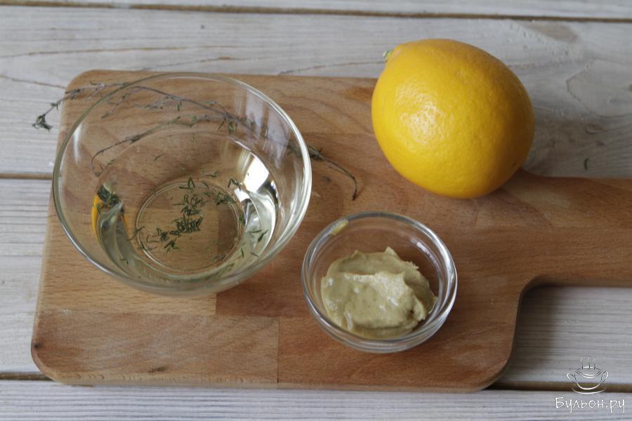 2. Для горчичной заправки подготовить все указанные ингредиенты в списке: растительное масло, горчица, сок лимона, сушеные тимьян и чеснок, соль.