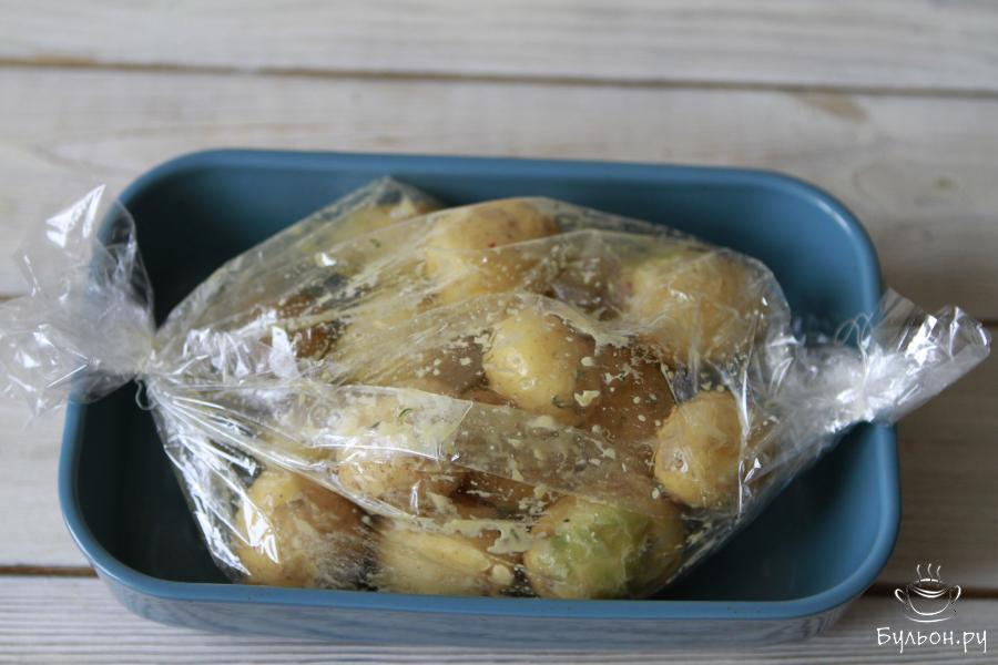 5. Картофель переложить в пакет для запекания и уложить его в форму. Разогреть духовку до 180 градусов. Запекать картофель в рукаве в духовке не меньше одного часа.