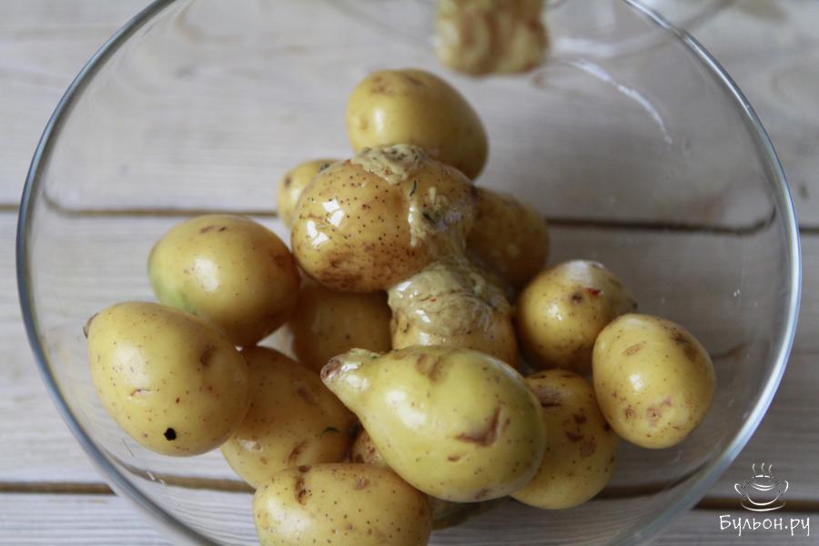 4. Готовой горчичной заправкой сбрызнуть клубни картофеля и вновь все хорошо перемешать. Отложить в сторону на 10-15 минут.