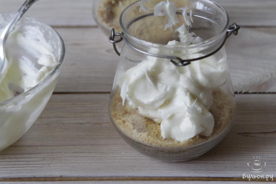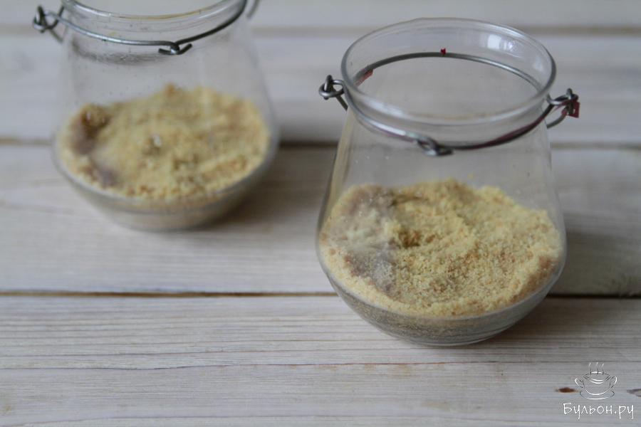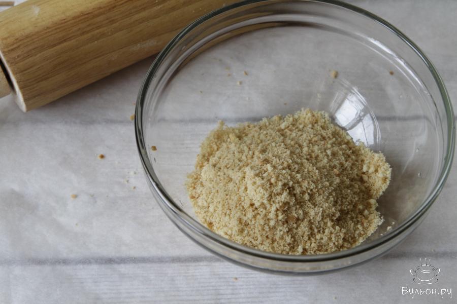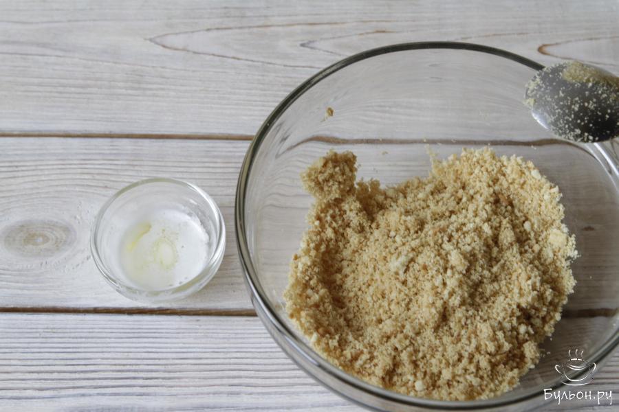 3. Для того чтобы основа десерта держала форму, в крошку добавить растопленное сливочное масло. Все хорошо перемешать.