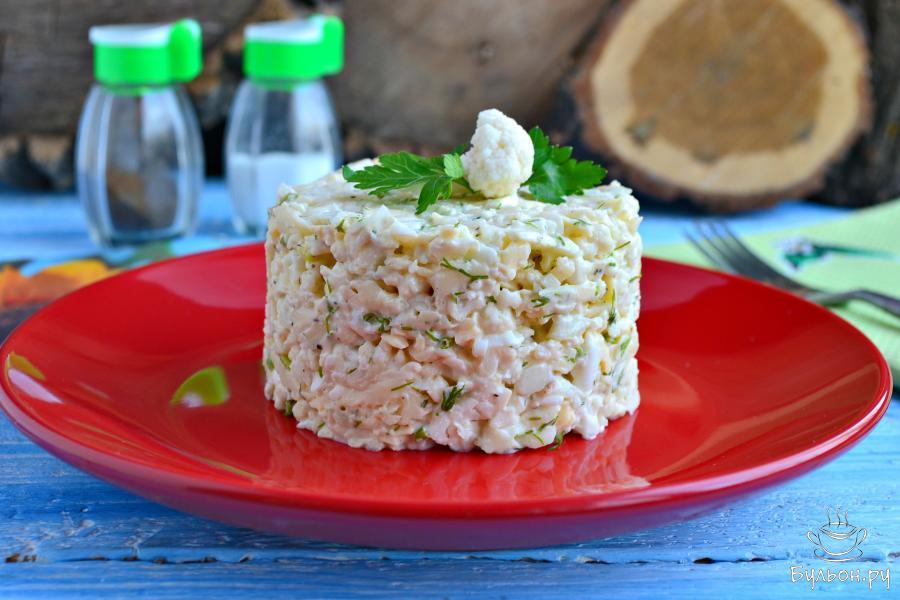 Простые и доступные рецепты вкусных блюд - находка для любой хозяйки. Этот салат однозначно относится к таким блюдам. Готовится салат просто и быстро, из обычных продуктов, получается очень вкусным, свежим и интересным, благодаря сырой цветной капусте. Такой салатик можно предложить в самостоятельном виде или же, дополнить им любое мясное блюдо. Обязательно попробуйте, вам салат обязательно понравится. Заправлять салат можно майонезом, сметаной или смешать эти продукты вместе. Зелень для салата подойдет любая, на ваше усмотрение.