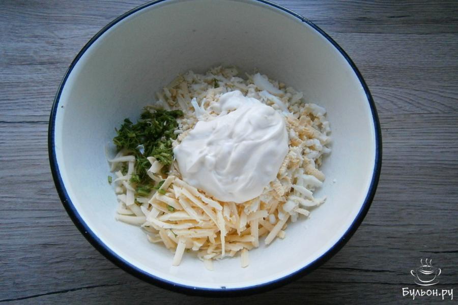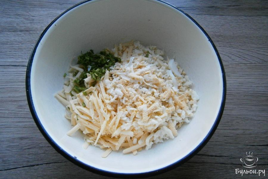 3. К крошке из капусты добавить сыр, натертые, предварительно сваренные яйца и измельченную зелень - я использовала укроп.