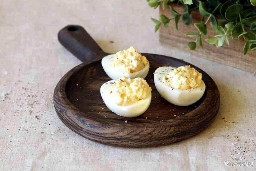 5. Фаршированные яйца готовы. Если не планируете подавать сразу, убрать заготовку в холодильник под пленку. Перед подачей украсить французскими или другими любимыми травами. Приятного Вам аппетита.