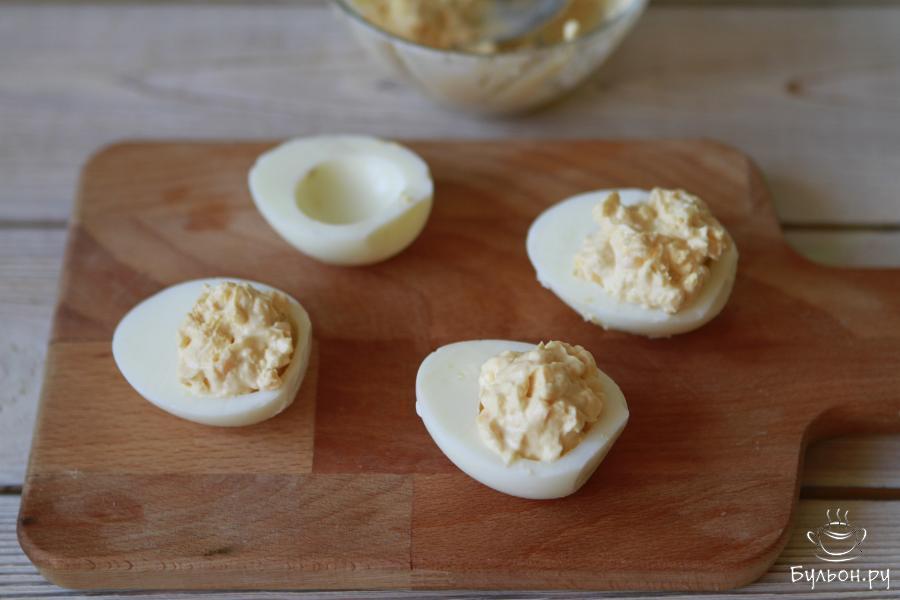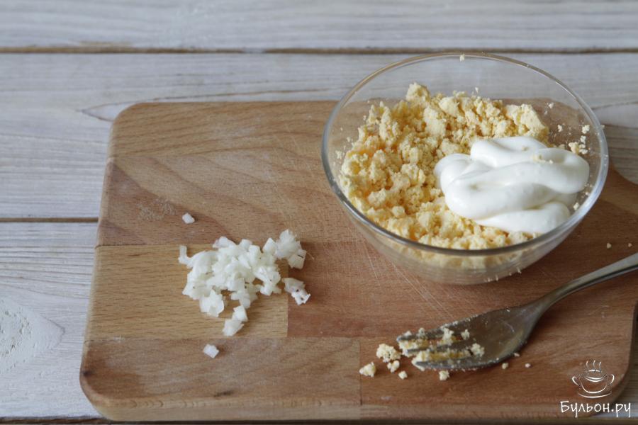3. Аккуратно извлечь желток, не повредив лодочку белка. Желтки переложить в чашу и размять вилкой. Зубчик чеснока мелко измельчить и добавить в чашу к желткам. Заправить все майонезом или сметаной. Количество майонеза в рецепте указано приблизительное.