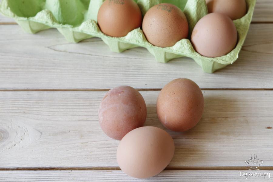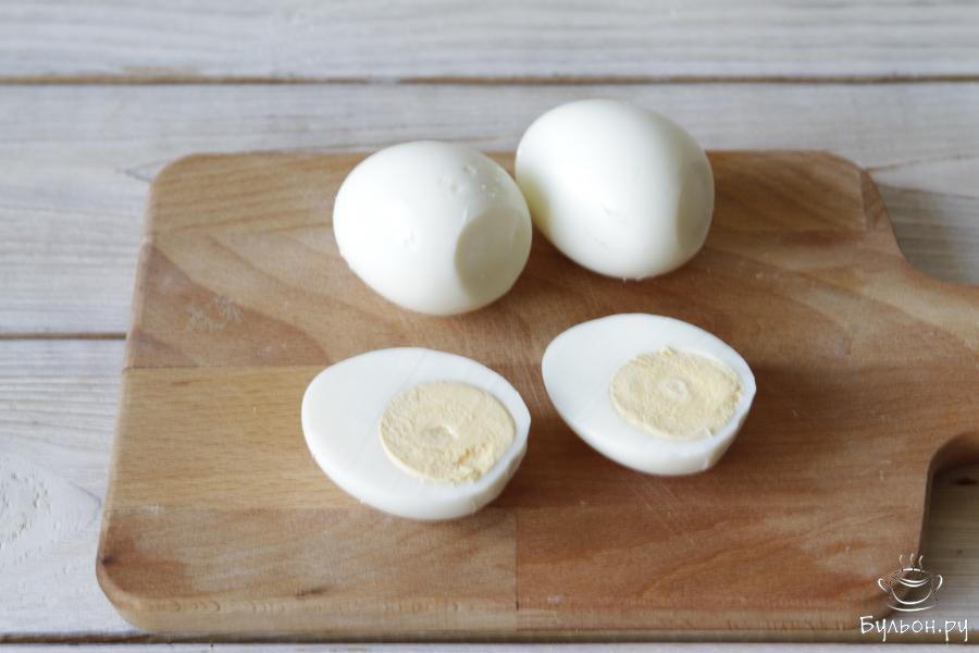 2. Яйца отварить до готовности в слегка подсоленной воде. Остудить и очистить от скорлупы. Разрезать яйца на две половинки.