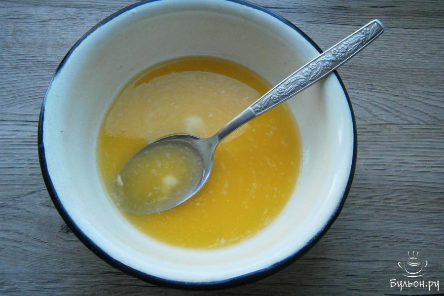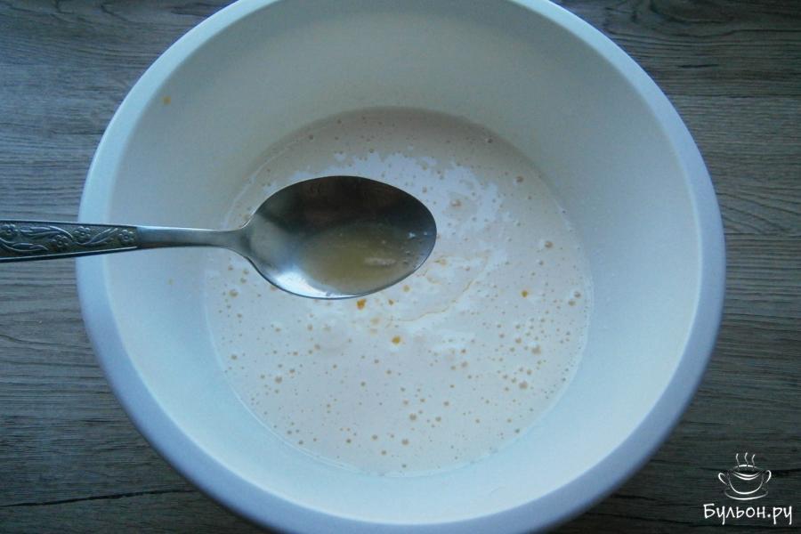 4. Далее, также, продолжая взбивать смесь, частями влить охлажденное растопленное масло, добавить ванильный сахар.