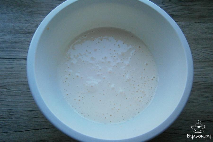 3. Взбить яйца миксером до достаточно пышной пены, затем, постепенно всыпая 100 г сахарного песка, продолжать взбивать около 7-10 мин. Масса должна быть светлой и пышной.