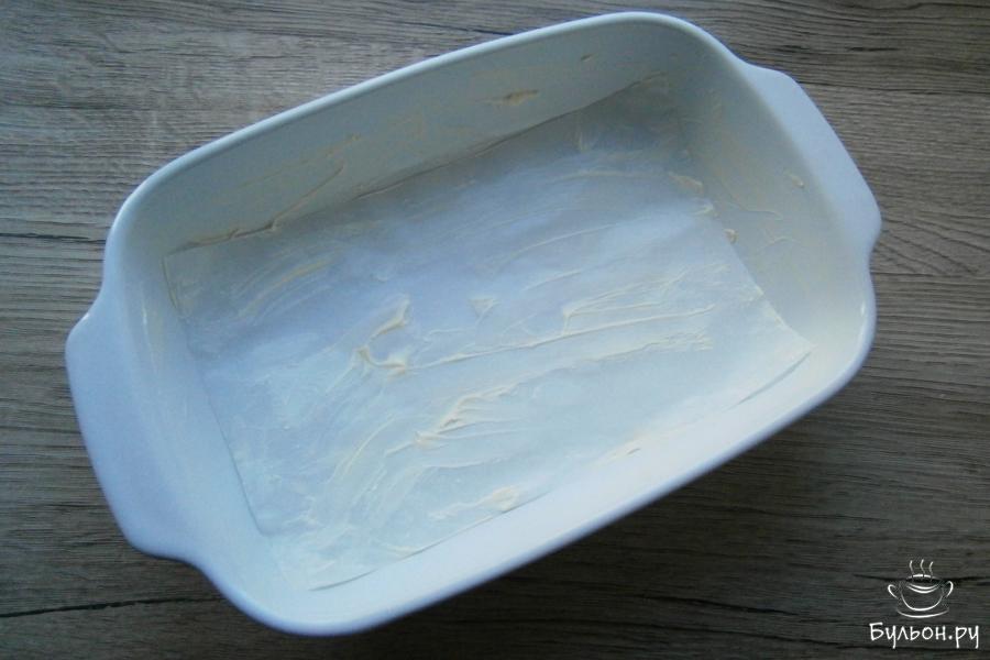 7. Небольшую форму, диаметром не более 16-17 см застелить пергаментом и смазать кусочком сливочного масла - достаточно будет 10 г.