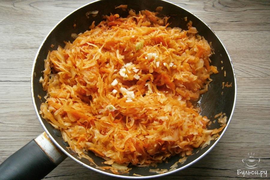 9. Капусту потушить на небольшом огне, периодически помешивая около 15 минут. В конце тушения добавить зубок измельченного чеснока, все еще раз перемешать, убрать сковороду с огня. Капусту полностью остудить.