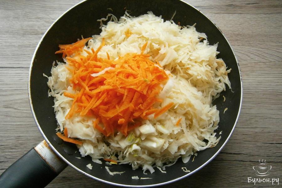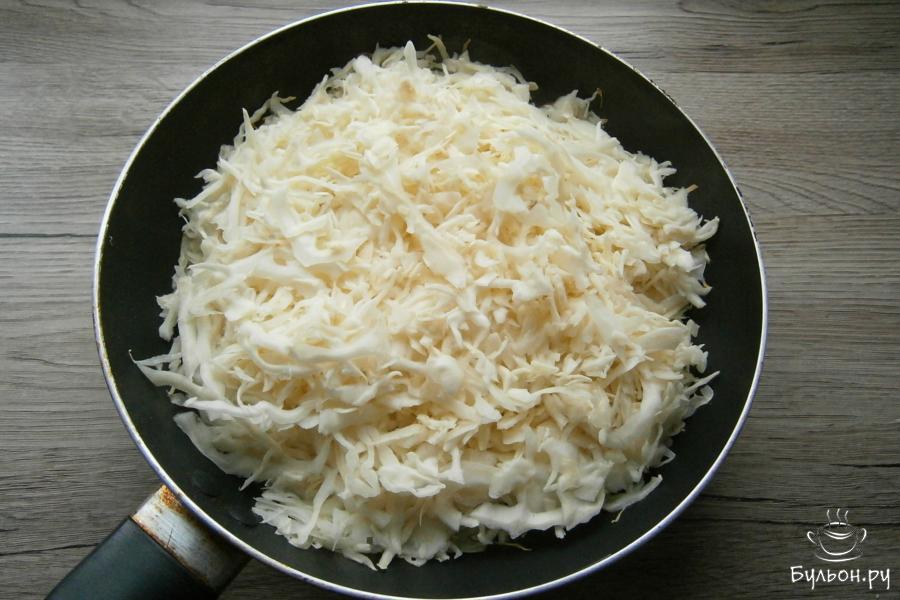 6. Пока тесто "зреет", капусту белокочанную тонко нарезать и немного порубить ножом, посолить и чуть помять. Капусту отправить в горячую сковороду, добавив несколько ложек растительного масла.