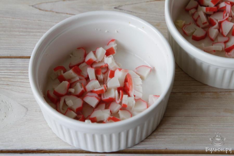4. В произвольной форме нарезать крабовые палочки. Формы для запекания (или одну большую форму для запекания) хорошо смазать сливочным маслом. Выложить в них крабовые палочки.