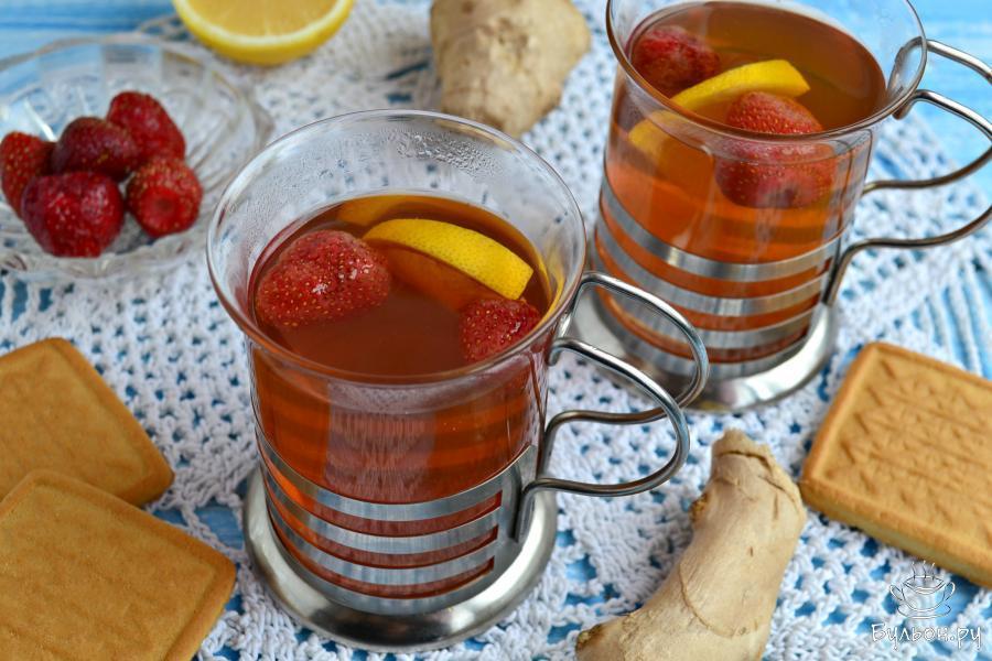 В холодное время года употребление горячих витаминных напитков - это профилактика простудных заболеваний и приятное ощущение тепла. Для тех, кто уважает имбирь, предлагаю приготовить замечательный имбирный чай - вкусный и очень полезный. Всем известно, что имбирь - довольно острая и своеобразная пряность, особенно в свежем виде. Корень имбиря нужно применять с осторожностью и в небольших количествах. Чай с имбирем лучше всего употреблять утром и в течение дня так, как он хорошо бодрит. Добавление в чай клубники и клубничного сиропа немного приглушит ярко выраженный аромат и вкус имбиря, придаст напитку легкую нотку теплого лета.